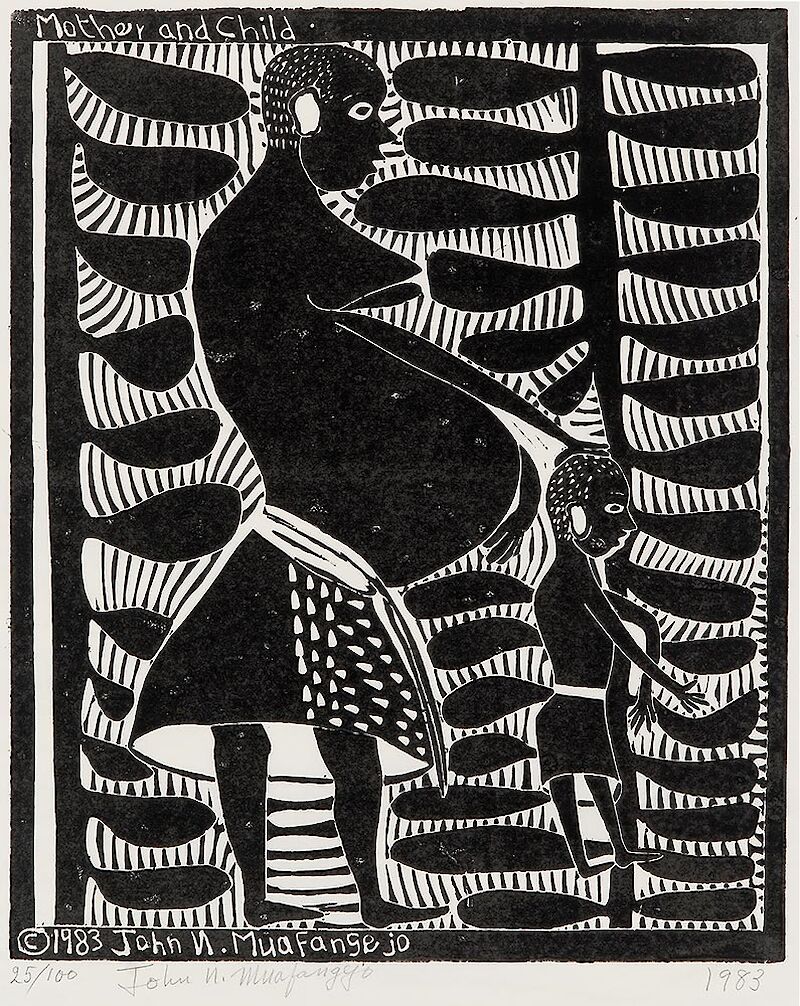Mother and Child is a linocut by John Muafangejo that reflects one of his recurring themes; family and community. The print depicts a mother with her child, a subject that appears often in his work as part of his focus on everyday Namibian life. Like many of his pieces, it combines simple forms with bold contrasts to convey both intimacy and strength.
